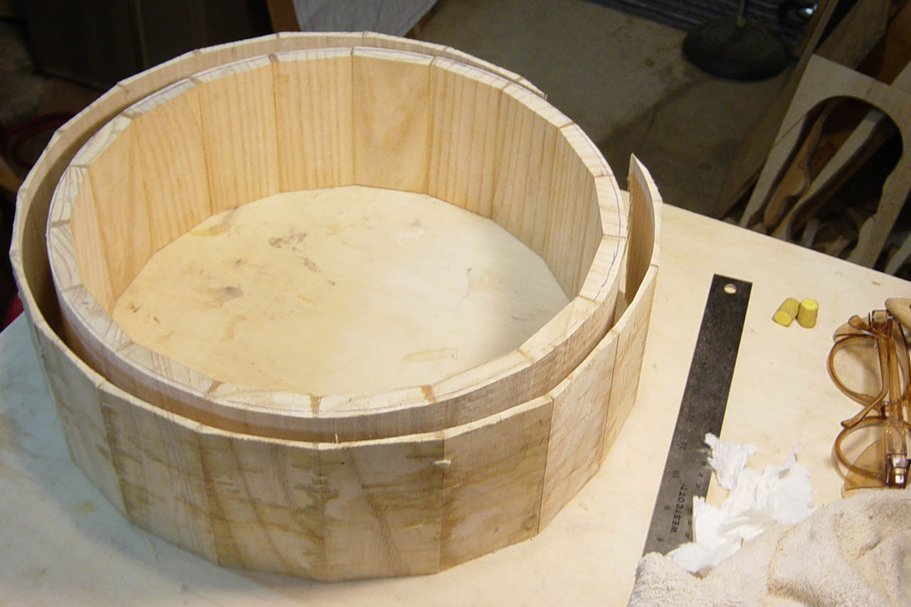They made a deal - Woody would supply the wood (how appropriate) and Larry would figure out how to cut the staves at the correct angle on the table saw. After the staves are cut, gluing the rim was a simple matter of applying glue, setting the pieces together, and then clamping by gradually adding more and more rubber bands.