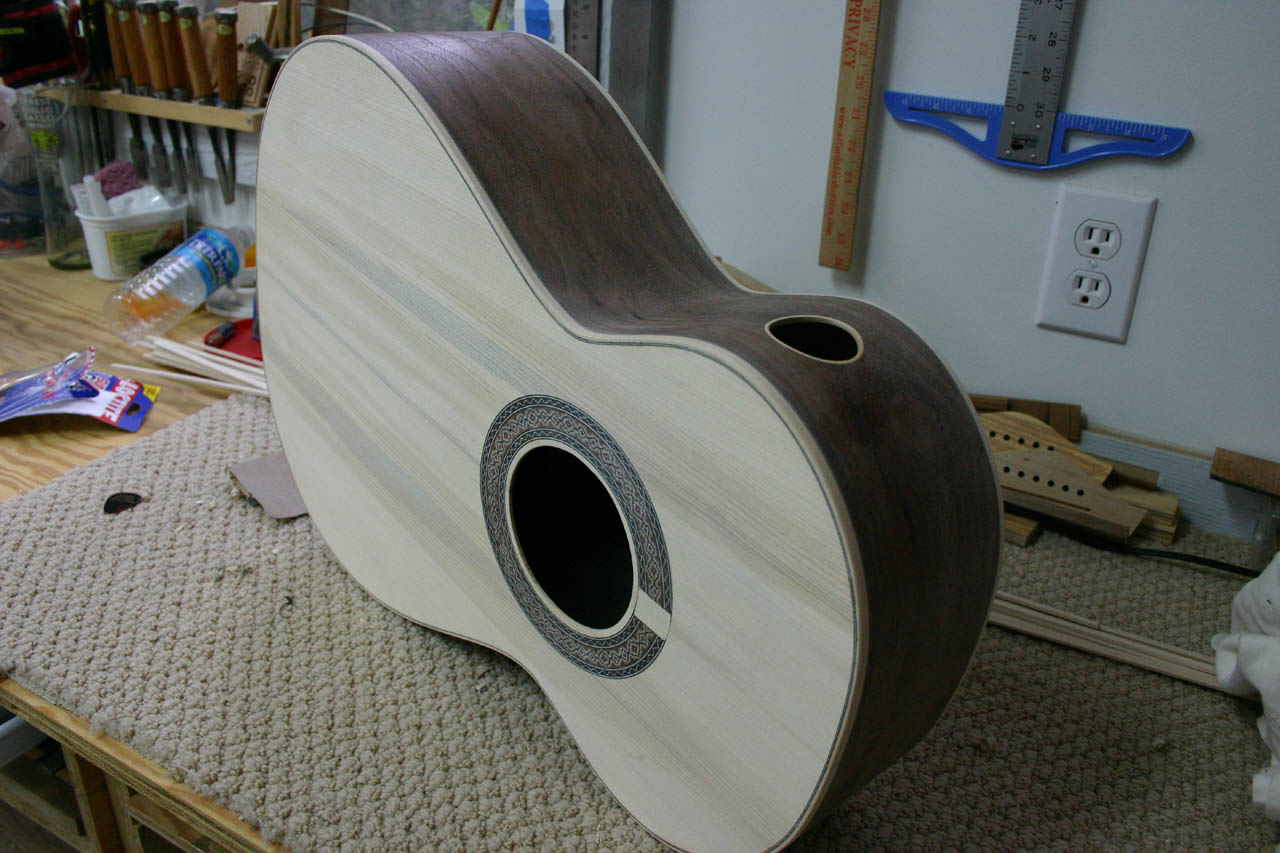 Walnut B/S Dreadnaught/sitka top-body is done, working on neck (this is the guitar my nephew is building with a lot of his uncle's help!). Ebony binding, walnut rosette, ebony fretboad and bridge.