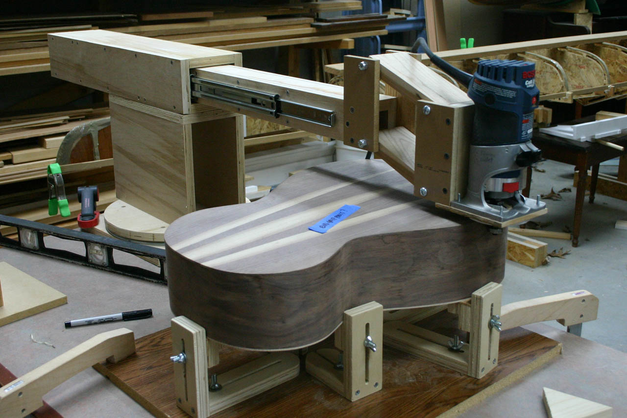 This jig uses the same guitar body carriage as another type of jig, but differs in that you move the router rather than the guitar body. It makes the jig more complicated but,
