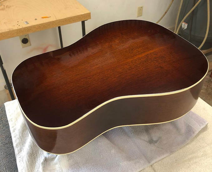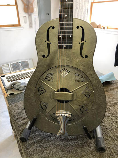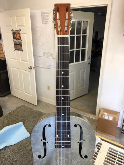 I completed the National Duolian that was included in the last post. I installed a radiused fretboard (original was flat) and new frets on this guitar because it was split and crumbling much like the old Silvertone the group worked on.
