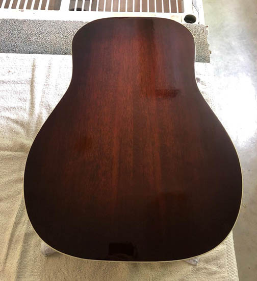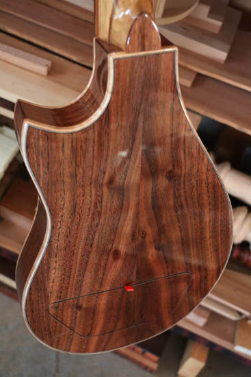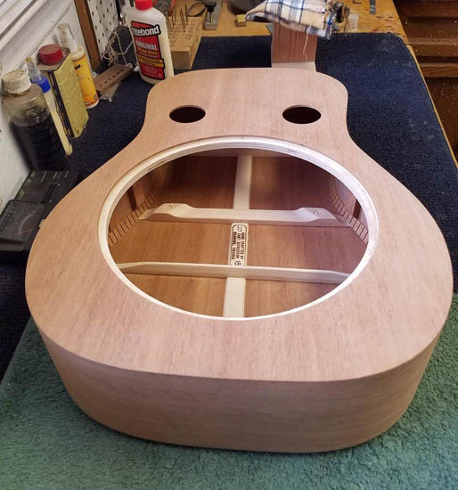 All mahogany dobro in process. Finish not done yet. This is reclaimed mahogany from Black Dog. I decided to do a dark stain with a shade on the edge. One pic before stain showing internal braces.