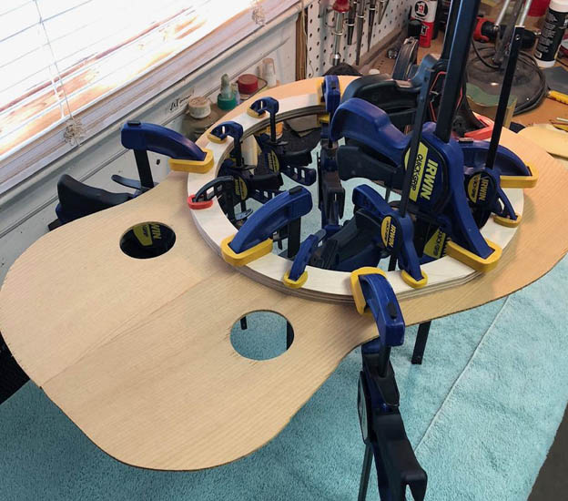 So this is some rosewood (Brazilian I think) that was given to me a few years ago. It had some defects, voids, black splotches, etc, so I had put it away and forgot about it. With a slowdown in repair work during the pandemic, I decided to dig it out and see if I could do something with it. Side pieces had some cracks out on the edge so were not wide enough for a dread but I had been wanting to build a rosewood dobro and they we’re wide enough for that. They also had pins holes which I will fill. I used epoxy and filled the voids on the back. I think they will be fine. The top is torrified red spruce that had a grain lines that curved toward the center seam. Cosmetically for me it was not desireable for guitar top but works for a resonator since most gets cut away, and covered by fretboard. This is a work in progress...