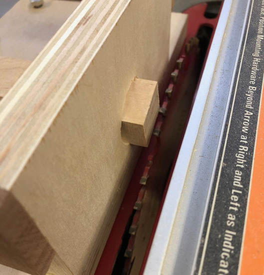Inserted the square stick through the holes and positioned it close the the saw blade. With the saw running, I raised the blade until it made contact with the stick, rotated the square stick in the round hole, and raised the blade until round dimension was achieved. I fed the stick toward the fence. The saw fence served as a stop to get the needed length of round.