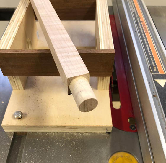 I had to make a dowel stick for a banjo. It needed to be a tapered square stick with a round dowel on the end to go into the neck bore. I chose not to just use a dowel inserted in the stick and neck but to make it in one piece like the original would have been. I built a fixture to use on my table saw. I drilled a hole In the fixture that was slightly larger than the finished square dimension of the stick at the widest point. Next size standard bit that was larger than the stick measuring across the points. I cut my stick square to this dimension (same as hole across the points).